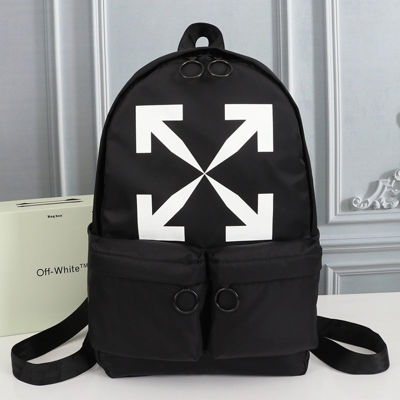 Black arrow backpack with white Off-White™ arrow in white print at front. Top handle. Two-way zip closure at main compartment. Two front zipped pockets, Black industrial adjustable shoulder straps