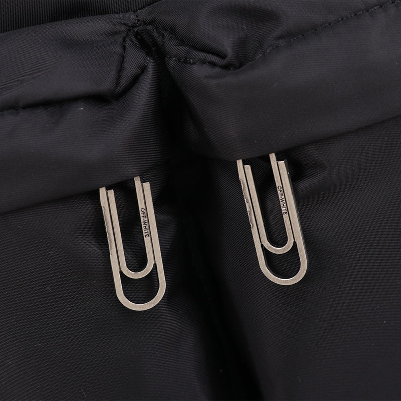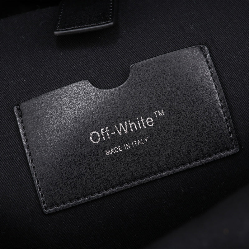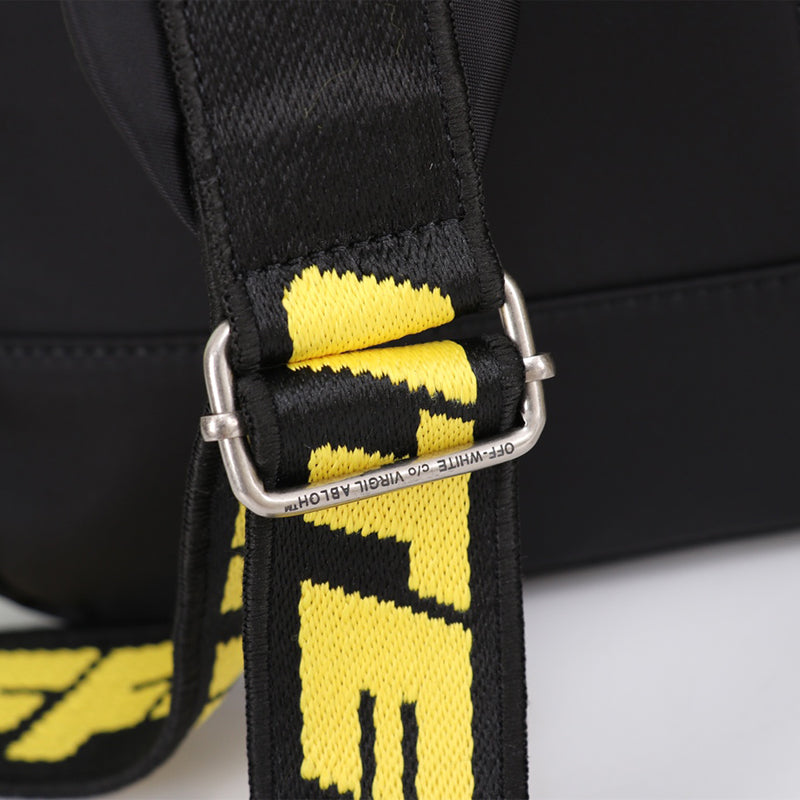 Black arrow backpack with white Off-White™ arrow in white print at front. Top handle. Two-way zip closure at main compartment. Two front zipped pockets, Black industrial adjustable shoulder straps